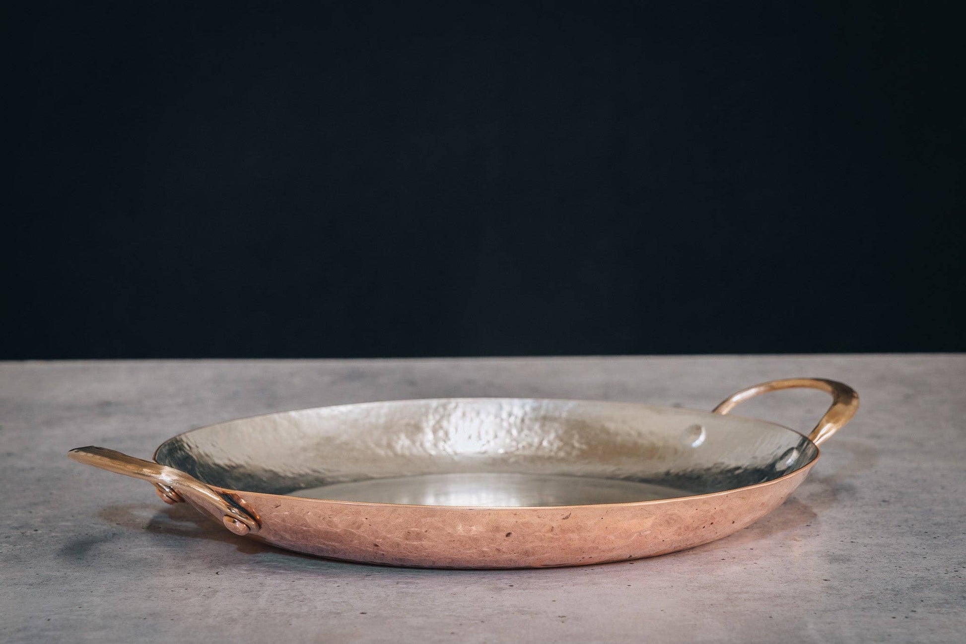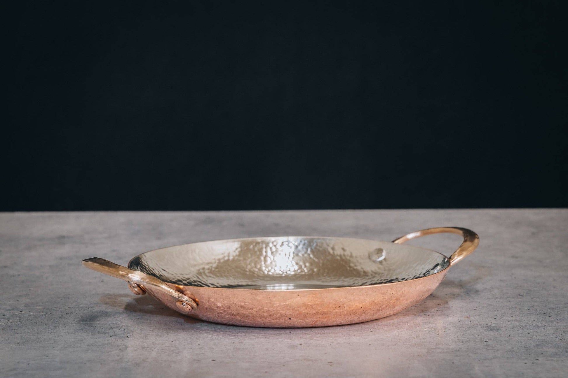 A staple of the professional kitchen, copper as a cookware medium provides excellent heat conduction for precise control, quick heating, and fast dissipation, with very balanced distribution. Our copper cookware is forged by hammer from .080" copper and given a hand-applied tin lining. Adorned with two bronze loop handles.